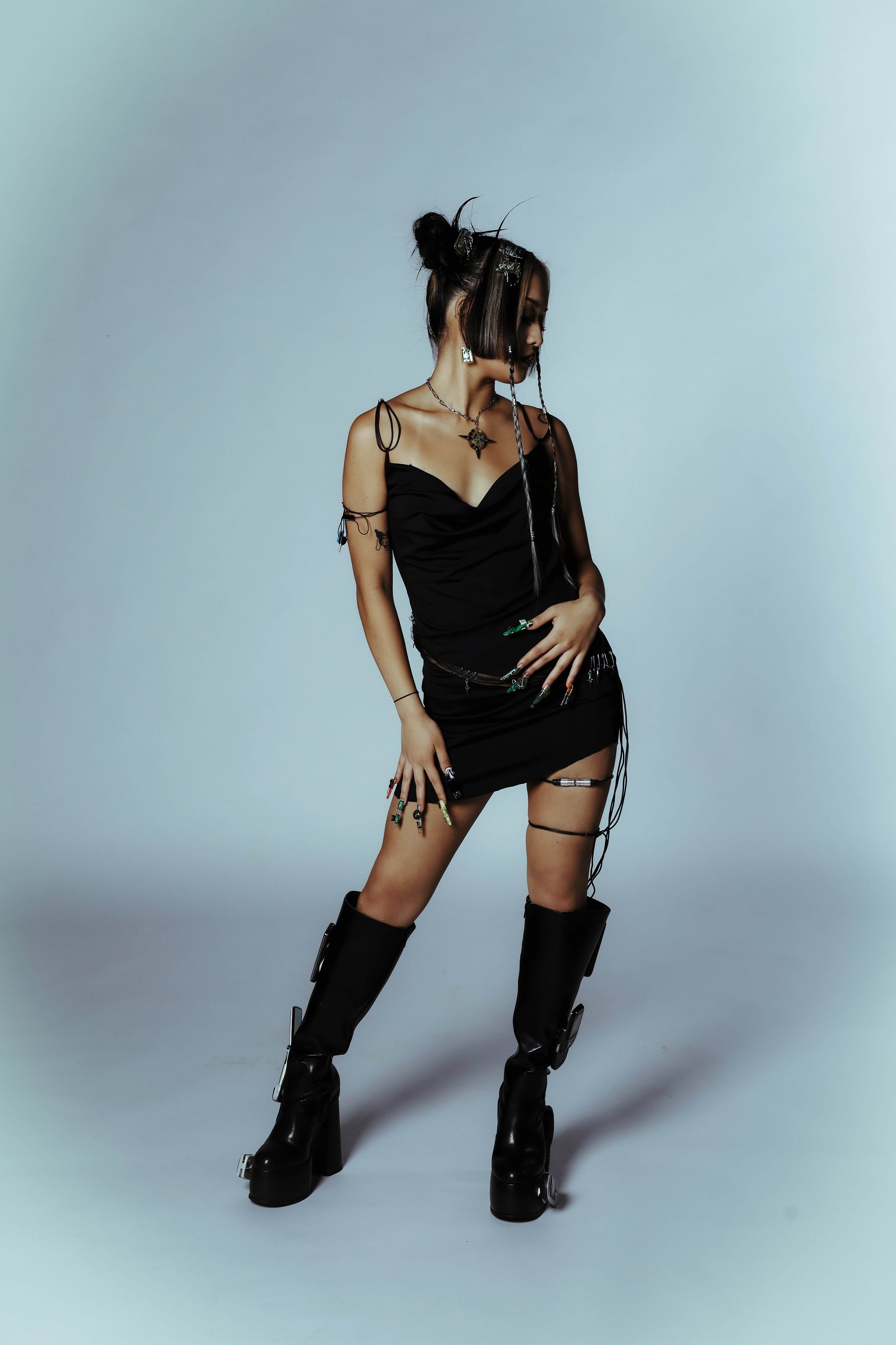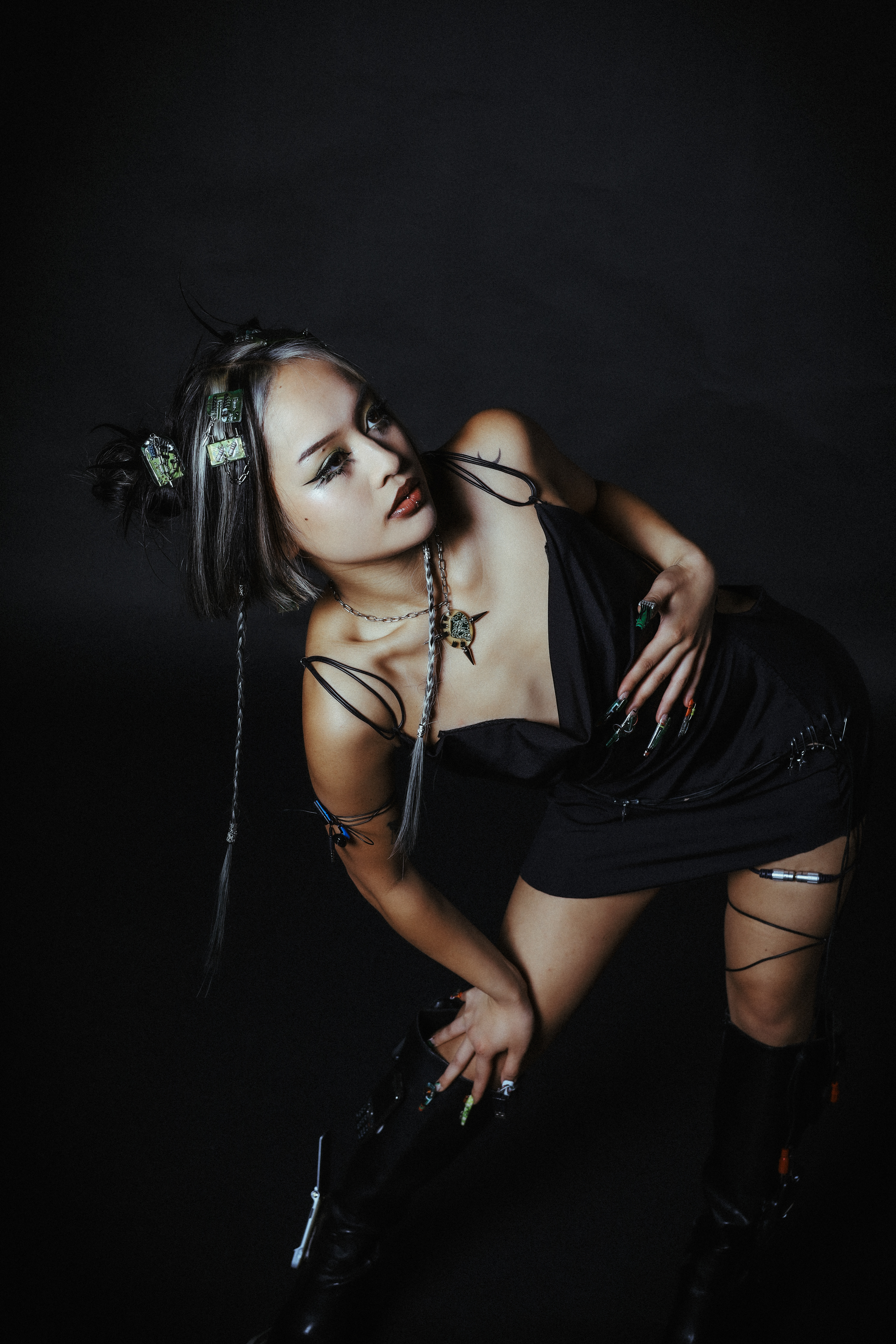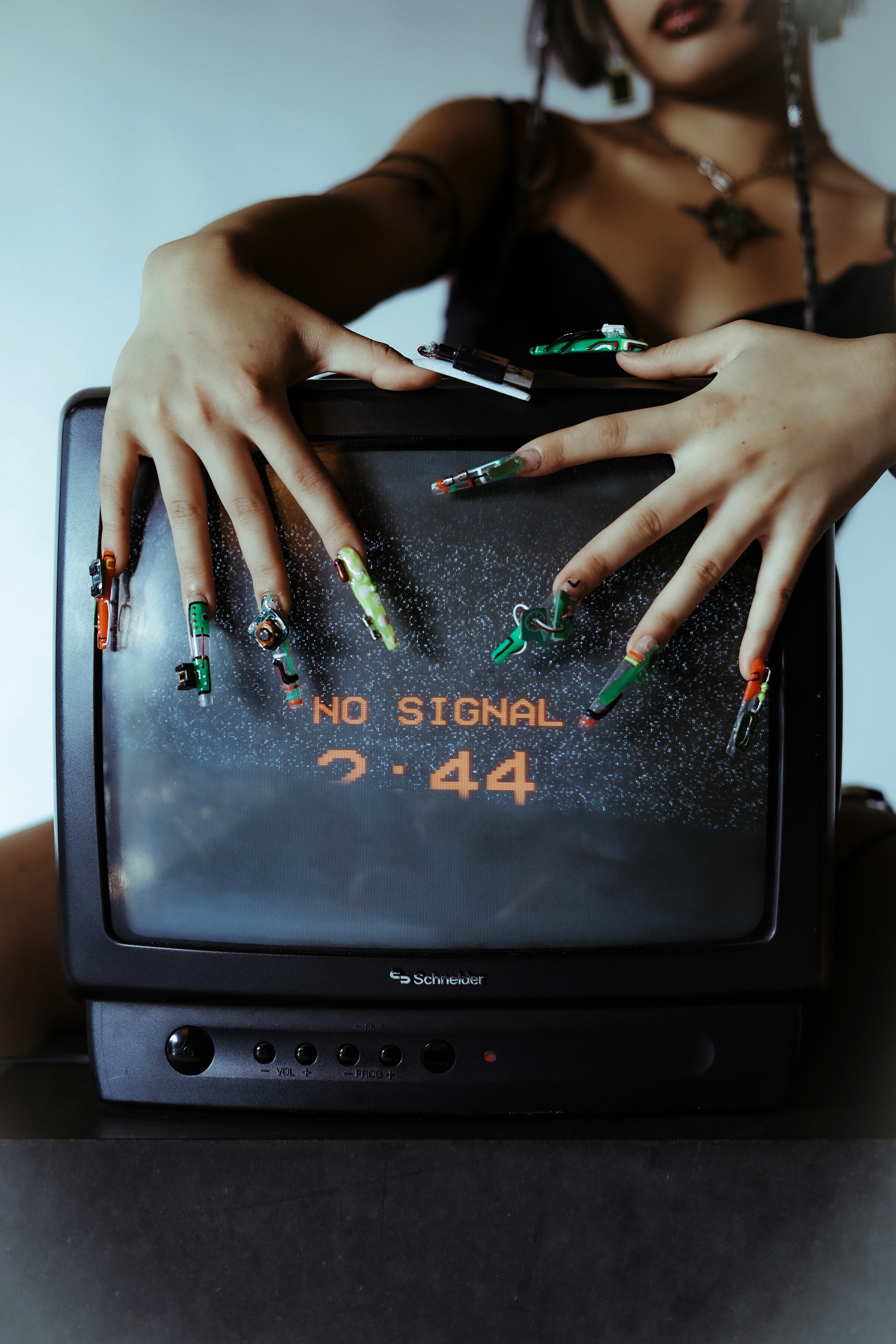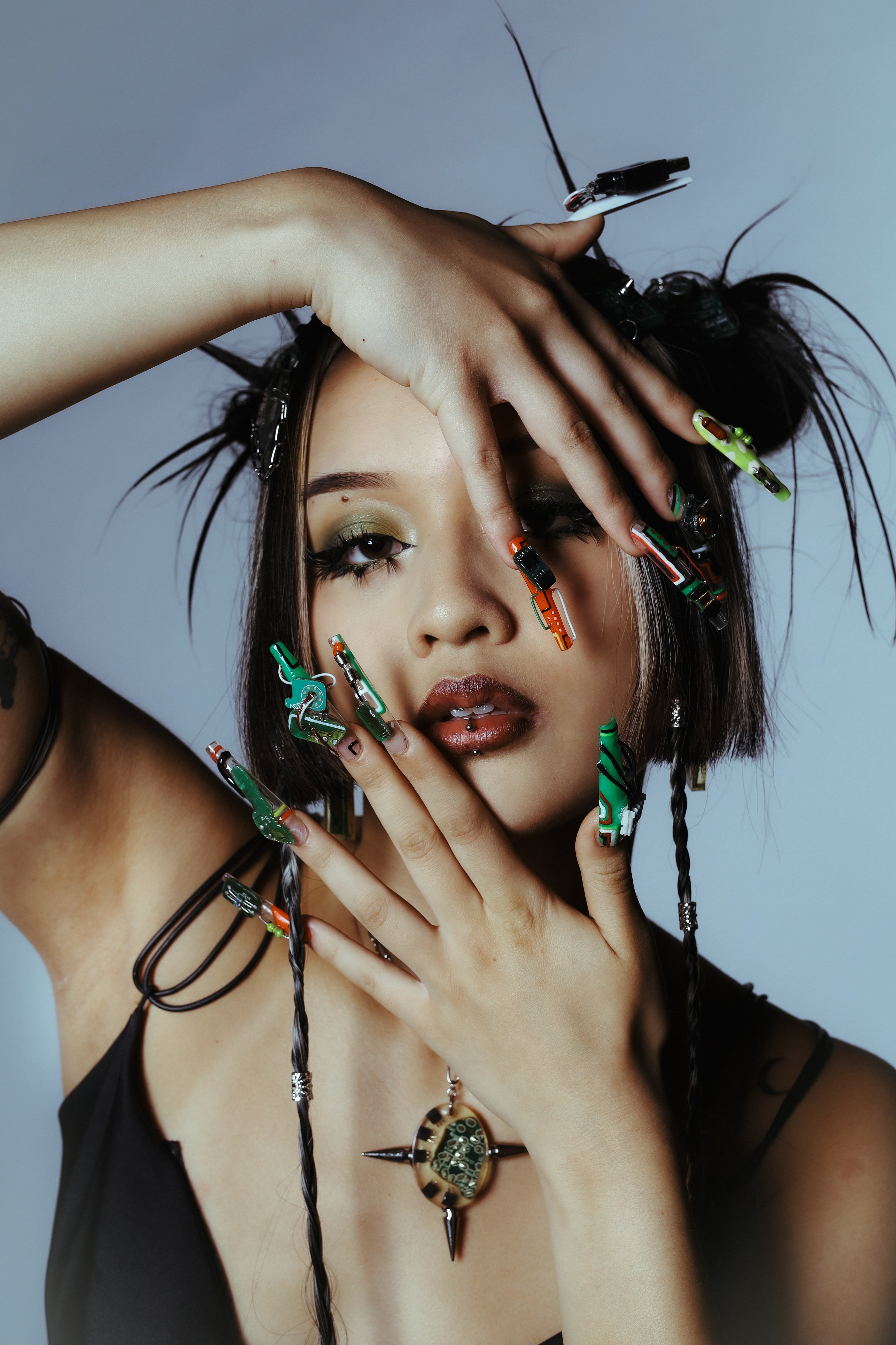 a sustainable concept made from old electronic devices, motherboards and cables. concepted by me, fashion and nail design by lena Müller.